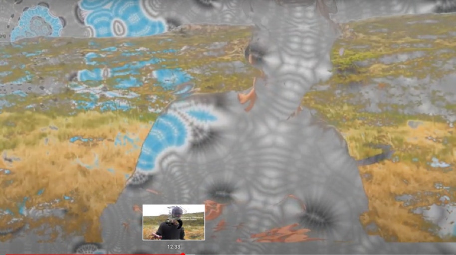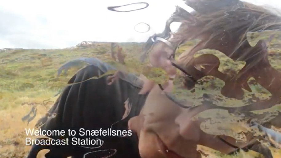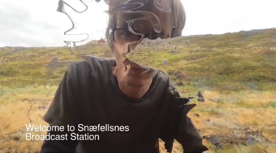 In ‘Snæfellsness Broadcast Station’, Haraldur Karlsson reports live from Snæfellsnes, the artist playfully presents the surrounding land- scape in which he has created a simple set up of a wooden chair. A child occasionally shares the screen, waving to observers. Interspersed with the landscape scenes and the overlay of different video warping effects are weather maps of the Snæfellsnes peninsula with dramatic overlays of fire-spitting and tornadoes swirling. The work is seemingly a commentary on the role of the Snæfellsnes peninsula in local lore: it is the place where French author Jules Verne begins his 1871 Science Fiction classic, Journey to the Center of the Earth, with entering a dormant volcano. The peninsula is also known for its heavy mythology of el- ven lore or Hidden People. The lore attached to this geographic location in Iceland is now part of every marketing campaign introducing tourists to the area.